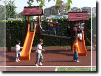 » un salone» cinque aule, quattro delle quali, attrezzate con servizi igienici, ospitano le sezioni, l'altra č adibita a dormitorio pomeridiano per i piccoli di tre anni